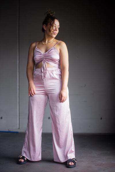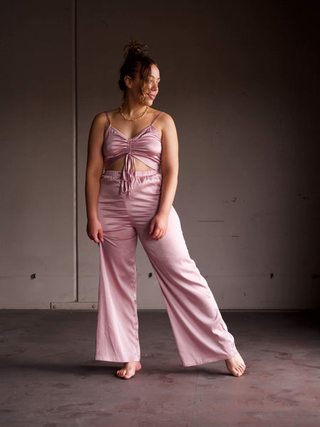 High waisted pants with elastic waist with drawstring.
